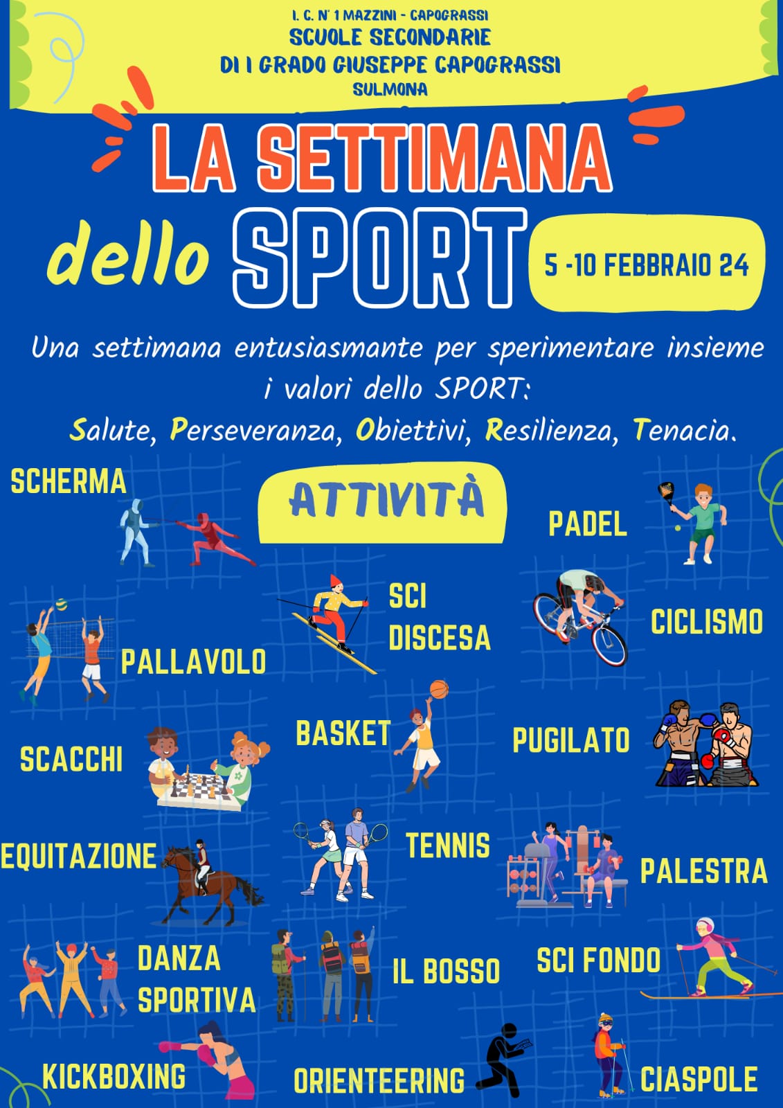 Al via la SETTIMANA dello SPORT 2024 Dal 5 al 10 febbraio i ragazzi delle Scuole Secondarie di I grado dell’Istituto prenderanno parte all’annuale edizione della Settimana dello Sport: ciclismo, basket, pugilato, tennis, pallavolo, orienteering, kickboxing, padel, scherma, scacchi, danza, sci, trekking, mountainbike, canoa, nordwalking, palestra. Queste le attività in cui si cimenteranno i nostri…
