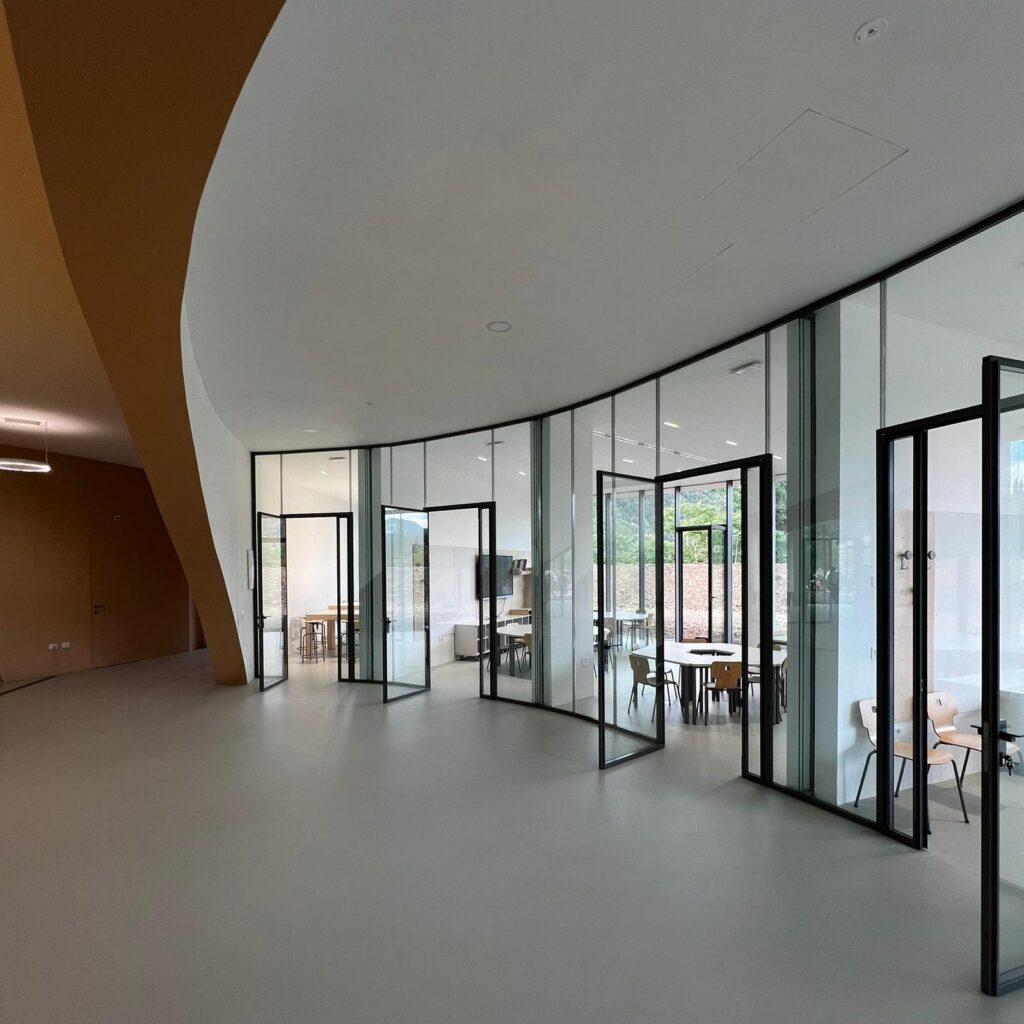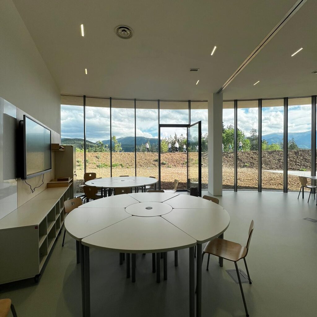 La scuola secondaria di I° grado di Pacentro è collocata nel nuovo plesso a forma circolare concepita all’interno di un percorso partecipativo della comunità.